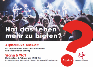 Alpha 2026 unter dem Thema: „Gemeinschaft erleben – Gemeinsam den Glauben entdecken“ Kick Off für den nächsten Alpha-Kurs ist am Donnerstag, 5. Februar 2026 um 19:00 Uhr im Vereinsheim des Tennisclubs Plüderhausen (beim Badesee). Schnuppert einfach mal rein und informiert euch unverbindlich. Offizieller Kursbeginn ist dann am Donnerstag, 26. Februar um 19:00 Uhr im Life in